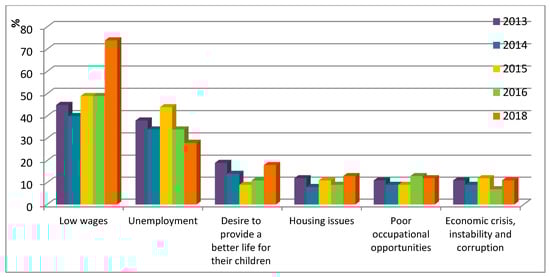 The question about the main reasons for migration was also raised in the survey. Despite the fact that the majority of respondents did not have job experience abroad, most tried to identify the main causes of external migration of their relatives and friends. The reasons which took the first two places during all years of the study are low wages and unemployment, and lack of suitable jobs (Figure 5). Thereafter, the most common factors were the desire to provide a better life for their children; housing issues (need to buy a new house or repair current housing); poor occupational opportunities (opportunities for professional self-realization); and economic crisis, instability, and corruption in Ukraine.