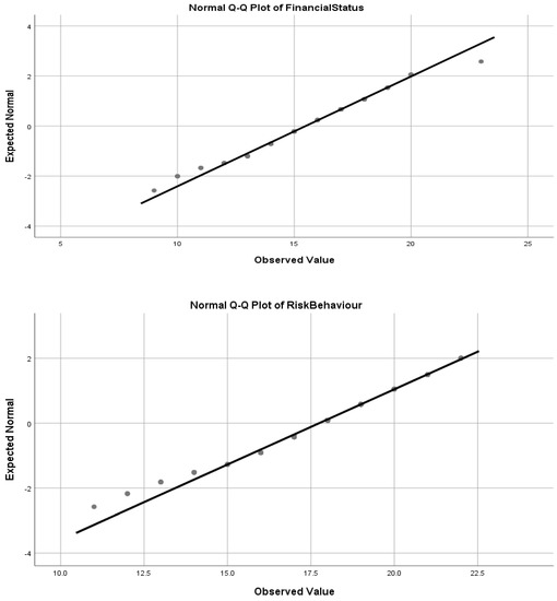 A normality test was conducted to determine whether the data collected are normally distributed or non-normally distributed. Data that are normally distributed indicated that there is consistency of the data collected, and in other words there are minimal amounts of mistakes or errors contained in the data. The Q-Q plot pairs up corresponding quantiles from the samples, and in this case, it is between independent and dependent variables that determine whether the sample data collected are normally distributed by inspecting the scatterplot. If they are normally distributed, the points in the scatterplot should lie close to the line (Doyle 2010). In order to examine the normality of the data for this study, the graphic method of a normal Q-Q plot was used, and the results are presented in Figure 2.