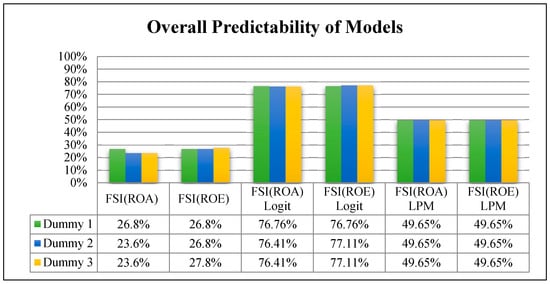 By using the linear probability method, the results show that the prediction accuracy declined to 49.65% in this method when calculated by all the three dependent variables. This indicates poor results relative to the logistic regression and the variance-equal weighted model. () used a linear probability model and confirmed a 60% prediction accuracy in assessing both the non-distressed and distressed banks.