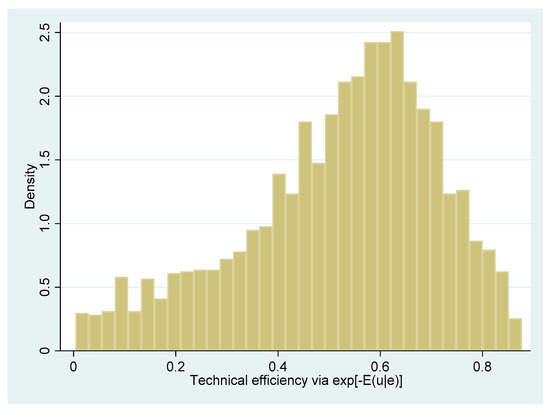 At this point, we computed technical efficiency estimates of agricultural households by disentangling the computed unobserved component from the compounded error. We followed Battese and Coelli (1995) approach to compute point estimates of inefficiencies by using the mean of this conditional distribution. Thus, the estimates of technical efficiency were derived as follows: