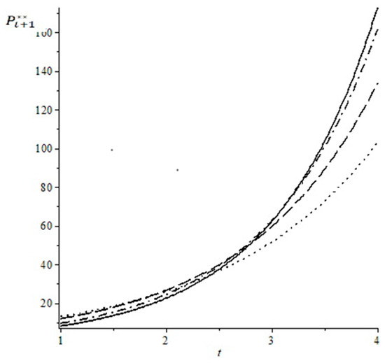 where represents the elasticity of the number of children with respect to the child allowance and the elasticity of the wage rate per human capital unit regarding the child allowance. However, it is possible that the pension benefits increase in the first periods after the introduction of a child allowance, and in the long term, the benefits will be lower than without the child allowance. The decisive term is the third one in the brackets: it is negative and its absolute value increases from period to period. That means even if the number of children and the wage rate per human capital unit increases, from some point of time on and thereafter, the pension benefits will be less than pension benefits would be without the increase of the child allowance. To illustrate the relationship, see Figure 1. □