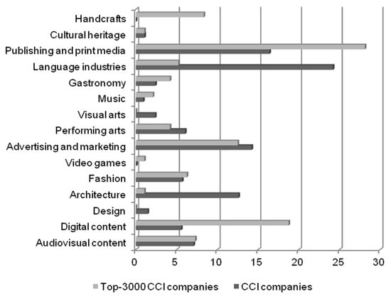 Relative weight of sectors within the Basque cultural and creative industries and relative presence of enterprises in each sector on the list of Basque Country’s top 3000 companies (in %). Source: Compiled by the authors on the basis of SABI and Empresa XXI data.