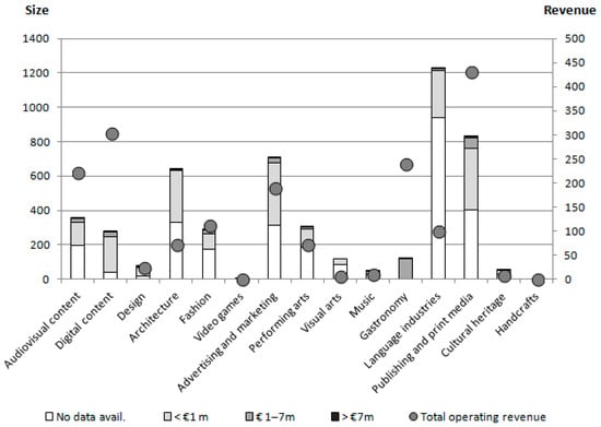 Breakdown of cultural and creative industries in the Basque Country by sector, size and operating revenue. Source: Compiled by the authors on the basis of information extracted from the SABI database.