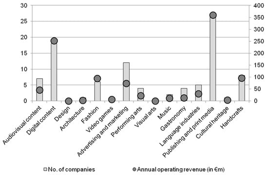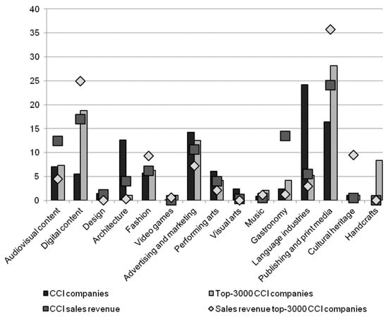 Comparison of cultural and creative industry sectors by number of enterprises and sales revenue (%). Source: Compiled by the authors on the basis of SABI database and Empresa XXI data.