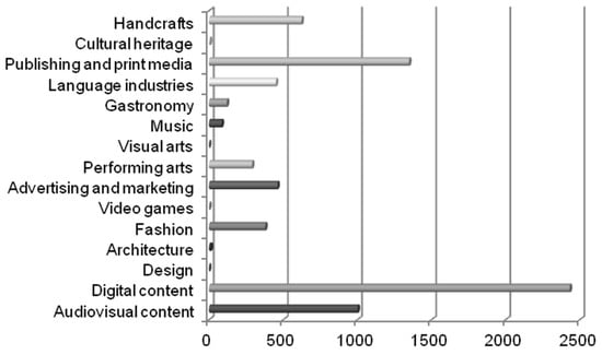 Analysis revealed that 4517 businesses, 626 or 13.86% of which pertained to the cultural and creative industries, received some sort of government funding of this type during this period (Figure 8). Companies in the digital content sector accounted for 44% of the companies to win funding—an extremely high proportion in comparison to those in other sectors such as design, which accounted for 18%, and fashion and audiovisual production, which respectively accounted for 7% and 6%. On the other end of the spectrum were enterprises in the handcrafts, performing arts, visual arts and music sectors, which together accounted for less than 1% of the cultural and creative industry companies funded.