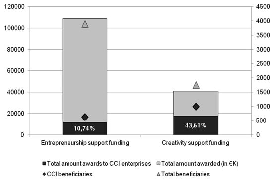 If town councils and individuals are excluded from the calculation, we quickly see that cultural and creative industry enterprises accounted for an impressive 67.84% of the companies awarded funding for creativity but only 14% of those awarded funding earmarked for entrepreneurial support. Enterprises in sectors such as music and the visual and performing arts that received virtually no funding from programmes providing entrepreneurial support fared far better in the category of creativity and figured more heavily on the lists of recipients of that type of funding programme.