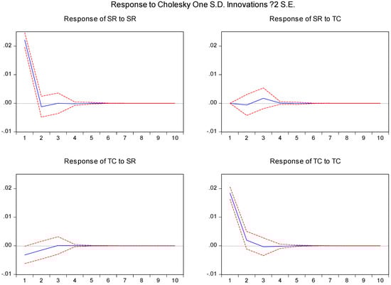 where each is the 2 × 2 matrix of coefficients, , is a factorization of the covariance matrix of , and is a matrix of orthogonalized innovations. This Equation (3) can be used to identify the dynamic response of spot returns to the TC shocks, which is the impulse response function (g):