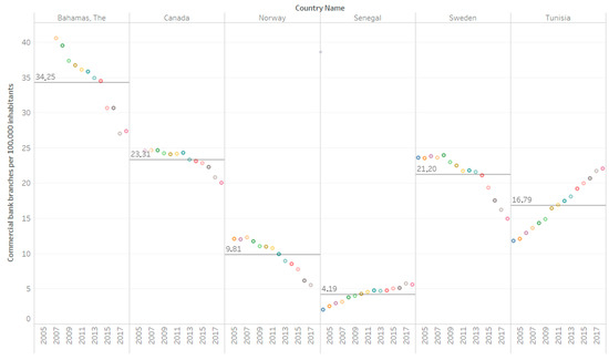 - The World Bank. 2020b. Commercial Bank Branches per 100,000 Inhabitants: Canada, Bahamas, Sweden, Norway, Tunisia and Senegal, 2004–2018 Data. Datos.Bancomundial.Org. Available online: https://datos.bancomundial.org/indicador/FB.CBK.BRCH.P5?end=2018&locations=CA-BS-SE-NO-SN-TN&start=2004&view=chart (accessed on 1 February 2020).