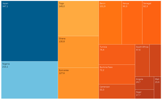 - The World Bank. 2020d. Population Density (People per sq. km of Land Area) of South Africa, Tunisia, Angola, Ghana, Senegal, Zimbabwe, Togo, Kenya, Mali, Nigeria, Benin, Burkina Faso, Cameroon, Niger, Japan and the Euro area. Available online: https://data.worldbank.org/indicator/EN.POP.DNST?end=2018&locations=ZA-TN-AO-GH-SN-ZW-TG-KE-ML-NG-BJ-BF-CM-NE-JP-XC&start=2018&view=bar (accessed on 4 March 2020).