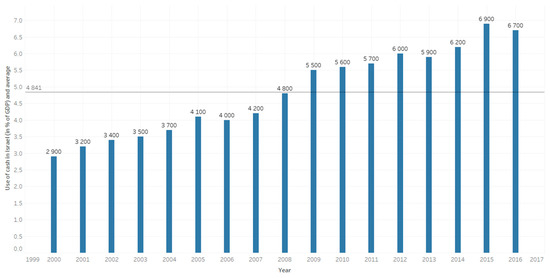 Sweden is one of the countries with the least presence of cash and many businesses and restaurants no longer accept cash payments. According to data from the central bank (Riksbank), the amount of cash in circulation has been cut in half since 2007. Thus, while in other areas the number of banknotes in circulation is growing, the same is not happening in this Nordic country (Nuño 2018). According to Fabris (2019), “Sweden heads the vanguard. According to the Riksbank (Sveriges Riksbank 2018), at the last count only 13% of Sweden’s payments were made using cash, compared with a European average of nearly 80%.” In Figure 7, it can be seen how Sweden constitutes a paradigmatic case of cash reduction since the middle of the last decade.