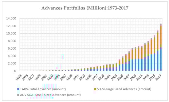 Advances of the banking sector in Pakistan are given in Figure 1 for the period of study, where out of the total advances, a considerable portion comprises large advances and a small portion comprises small advances. It is evident that gross advances have increased over time, but the disbursed loans are essentially large and not meant for the disadvantaged segments of society.