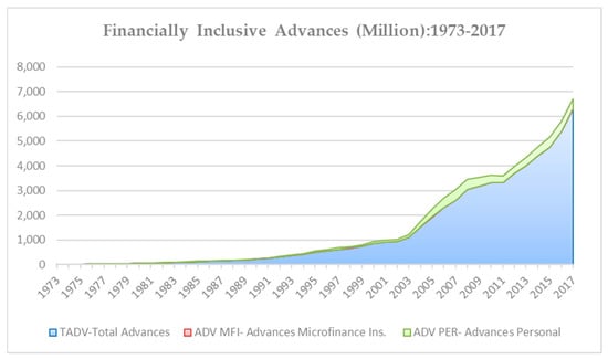 Another significant contribution is that this study constructs new variables, especially the micro determinants of the banking sector for financial inclusion, based on and fully supported by theoretical literature—e.g., personal advances of financial inclusion, which only takes into account the advances that are financially inclusive in nature (credit cards, consumer durable and personal loans).