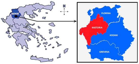 The Kastoria Regional Unit was selected as the case study of this paper. Kastoria is geographically located in Western Macedonia, bordering Albania on the north. Administratively, it belongs to the Region of Dytiki (Western) Macedonia and, together with Kozani, Florina, and Grevena, comprises the four regional units of the region (Figure 1). Kastoria consists of three Municipalities with a total population of 51,414 inhabitants. According to the 2011 census, 35,874 of the total population are residents of the municipality of Kastoria.