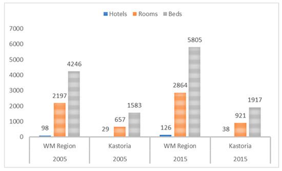 Figure 2. Number of hotels, rooms, and beds in the Region of Dytiki Macedonia (WM Region) and Kastoria in the years 2005 and 2015.