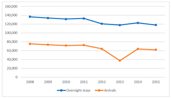 Figure 3. Evolution of the number of arrivals and overnights per year in Kastoria for the period 2008–2015.