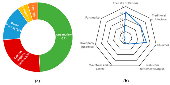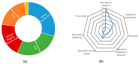 On the other hand, according to visitors in 2017, the predominant forms of tourism in Kastoria, with almost the same importance, are winter tourism and agro-tourism. Meanwhile, in the second degree, but at a measurable level, there are views that support the identification of the tourism form with cultural tourism and eco-tourism (Figure 5a). During 2017, the dominant assessment that the most significant tourism pole is the lake of Kastoria still exists, considering as the next important pole the mountainous areas with the ski center, as well as the traditional architecture of the area as the third tourism pole (Figure 5b). Finally, it is important to mention that the tourism resources, such as the tourist fur market, the lake prehistoric settlement, and the organization of the river party in Nestorio, are evaluated as less significant by fewer visitors.