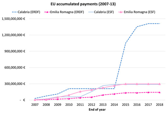 EU accumulated payments of European Regional Development Fund (ERDF) and European Social Fund (ESF) funds during 2007–2013 for Calabria and Emilia Romagna [Based on European Commission (2007–2017)].