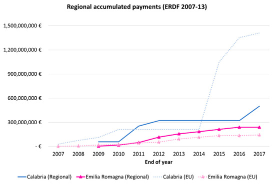 Regional accumulated payments of ERDF funds during 2007–2013 for Calabria and Emilia Romagna [Based on European Commission (2007–2017) and OpenCoesione (2019)].