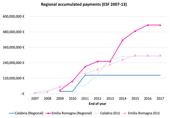 Regional accumulated payments of ESF funds during 2007–2013 for Calabria and Emilia Romagna [Based on European Commission (2007–2017) and OpenCoesione (2019)].