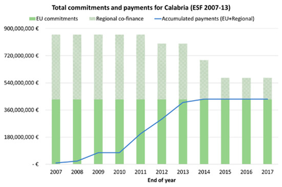 Total commitments and payments of ESF funds during 2007–2013 for Calabria [Based on European Commission (2007–2017) and OpenCoesione (2019)].