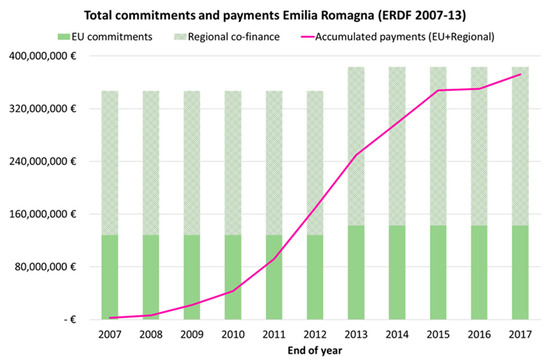 Total commitments and payments of ERDF funds during 2007–2013 for Emilia Romagna [Based on European Commission (2007–2017) and OpenCoesione (2019)].