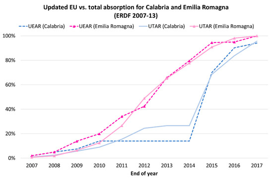 Annually updated EU commitments’ absorption rate (UEAR) and annually updated total commitments’ absorption rate (UTAR) of ERDF funds during 2007–2013 for Calabria and Emilia Romagna [Based on European Commission (2007–2017) and OpenCoesione (2019)].