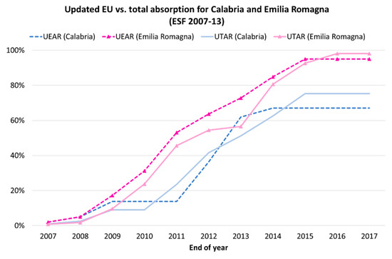 UEAR and UTAR of ESF funds during 2007–2013 for Calabria and Emilia Romagna [Based on European Commission (2007–2017) and OpenCoesione (2019)].