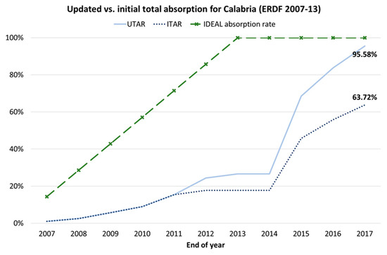 Figure 11 presents the UTAR and ITAR indicators for the ERDF funds during the policy cycle 2007–2013 in Calabria. Figure 11, Figure 12, Figure 13 and Figure 14 further illustrate the ideal proportional absorption rate that will be used in the statistical analysis in Section 4.3. Obviously, at the beginning of the period, both rates are equal as they are calculated based on the initial commitments before the reduction of regional co-finance. At the end of the cycle, ITAR is much lower compared to UTAR, which is now calculated based on the reduced total commitments (thus reaching a sufficient 95.6%) due to the decrease in regional co-finance. In fact, the ITAR equals 63.7%, highlighting that the actual absorption of the initially approved commitments is rather low. Therefore, the lower regional performance compared to the initial expectations is evident, probably due to the LMA’s administrative and/or managerial incapacity of absorbing funds (Milio 2007; Zaman and Georgescu 2009; Aiello et al. 2019). This low absorption efficiency indicates the reduced SFs’ spending, impeding actual regional growth.