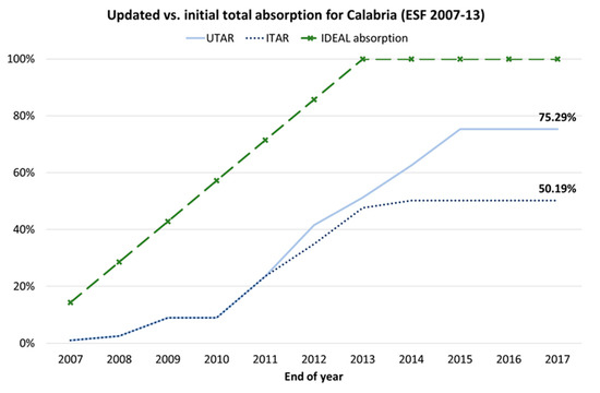Figure 12 shows the UTAR and ITAR indicators for the ESF funds during the policy cycle 2007–2013 in Calabria. At the end of the cycle, ITAR (50%) is lower compared to UTAR (75%), as in the ERDF case. In fact, although UTAR is already insufficient, the even lower ITAR sheds light on the inadequate LMA performance in terms of funds’ absorption.