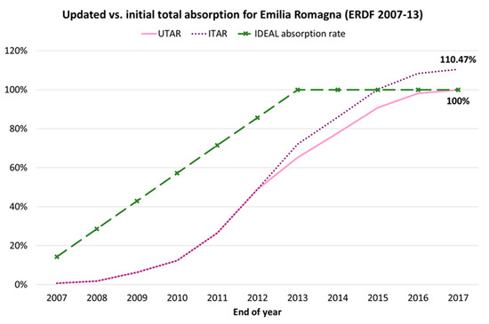 UTAR and ITAR of ERDF funds during 2007–2013 for Emilia Romagna [Based on European Commission (2007–2017) and OpenCoesione (2019)].