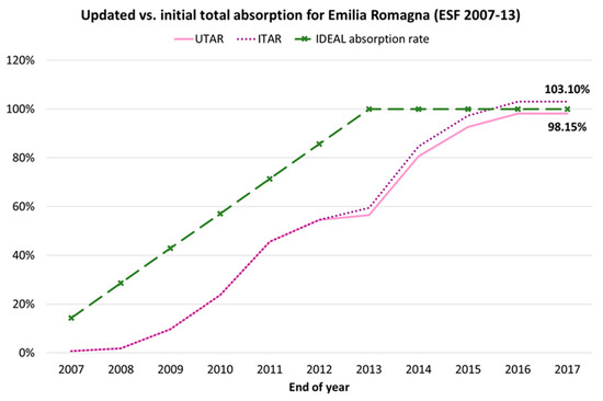 Figure 14 depicts the UTAR and ITAR indicators for the total ESF funds during 2007–2013 in Emilia Romagna. Once again, following the increase of the initial commitments due to the earthquake, ITAR at the end of the cycle (103%) is higher than UTAR (98%). Obviously, as the final accumulated payments are greater than the initial total commitments, ITAR is more than 100%.