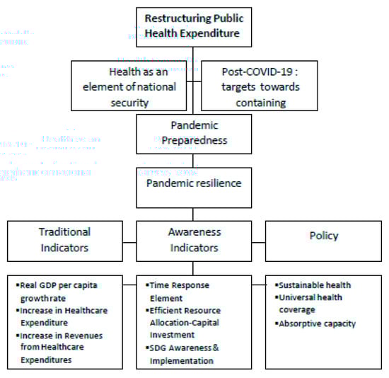 The motive behind this article is investigating alternative indicator measures for the effectiveness of public health expenditure on pandemic preparedness, to explain the reasons behind country variations in containing crises such as Coronavirus disease 2019 (COVID-19). The purpose is to analyse the shortcomings in the relationship between global public health expenditure and pandemic preparedness. The research methodology includes a macro-analysis of global health spending patterns, empirical and theoretical literature on global health expenditure, global health security indexes, and country case studies pre- and post-crisis. The results show that gaps in pandemic preparedness were already existent pre-COVID-19, calling for a new mind-set in the way public health expenditure is structured. Healthcare sustainability indicators should transition from traditional measures such as economic growth rates, public health expenditure rates, revenue coming from the healthcare sector, and rankings in the global health security index, to new awareness indicators. Public health expenditure, a facilitator of pandemic preparedness, coupled with the resilience of healthcare systems, could be used in conjunction with the traditional factors, along with the time element of a quick response to pandemic through preparedness schemes, the progress towards achieving sustainable health through the implementation of the United Nations Sustainable Development Goals, and investment in national healthcare capital to ensure efficient resource allocation. The policy recommendations are the restructuring of public expenditure to expand the absorptive capacities of healthcare institutes, eventually leading to sustainability and universal health insurance.