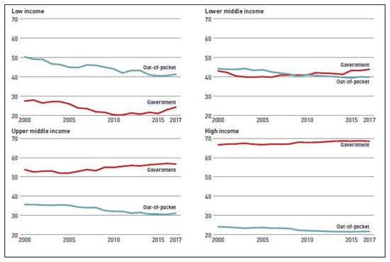 As shown in Figure 6, although out-of-pocket spending per capita increased between 2000 and 2017, the rate of increase was slower than government spending; therefore, it has consistently declined across all income groups. Out-of-pocket spending per capita in low income countries increased from US$14 in 2000 to US$18 in 2017, but because of increased public spending, these countries experienced an average decline in the share of out-of-pocket spending from 50% of total spending in 2000 to 41% in 2017.