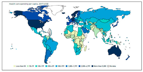 Variations in health spending per capita 2017 (US$). Source: WHO (2019).
