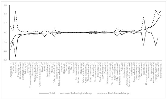 - Madariaga, Rafa. 2018. Factors driving sectoral and occupational employment changes during the Spanish boom (1995–2005). Economic Systems Research 30: 400–21. [Google Scholar] [CrossRef]