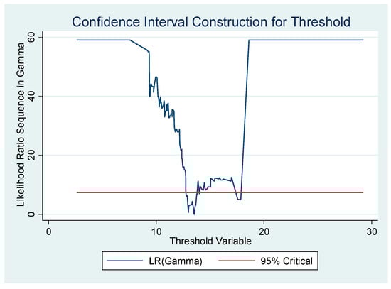 The first step in the estimation was to test the null hypothesis of linearity, , against the threshold model in Equation (2). If the null hypothesis is rejected, then statistically, there is evidence of a threshold level of regression with two regimes, and the model is nonlinear. When there exists a threshold value, the sample is estimated to be in reference to the first regime and in reference to the second regime. The first regime is when the threshold level variable exceeds the threshold value. Statistically, both regimes give different decisions in terms of estimation.