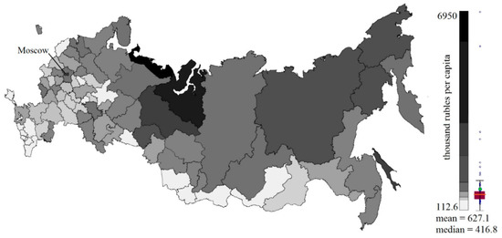 The characteristics of the indicators are presented in Table 1, Figure 1 and Figure 2. To focus on the relationship between production, distribution, and consumption of goods all indicators had been converted per capita for not taking into account the population of the areas under consideration. The data is presented in rubles, the official currency of Russia. The ruble/US dollar exchange rate in 2018 was within a fairly wide range from 55.7 ruble/US dollar to 69.99 ruble/dollar.