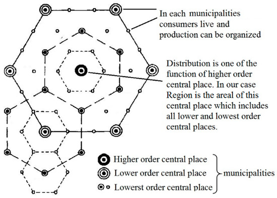 The data describing the production–distribution–consumption cycle is hierarchically structured, i.e., nested. Manufacturers produce goods, the volume of shipped goods by manufacturers in total accounts for the volume of goods shipped in the municipality. In turn, the sum of goods produced in municipalities is the volume of goods shipped in the region. Thanks to the supply chain network, this volume of shipped goods in the region is sold to consumers in the municipalities in which they are produced or to the outside market. In supply chain distribution centers and wholesalers combine the flows of goods produced by manufacturers and not consumed in municipal entities, thus they organize intra-regional (inter-municipal) and inter-regional flow of goods. In this case, we observe one of the functional roles of the center, stated within the framework of the central places theory (Figure 3).