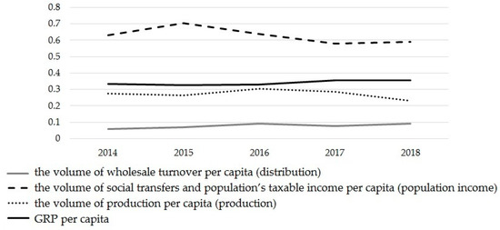 Moran’s index positive in terms of production (0.23–0.31), but it is not so high as in terms of population income, where Moran’s index during the period 2014–2018 ranged from 0.58 to 0.7. Such autocorrelation is visually manifested in a smooth transition of color from darker to light in Figure 3. The positive Moran’s index shows that a high population income in some municipalities is observed against the background of a relatively high population income in neighboring municipalities. Conversely, low-income municipalities tend to be adjacent to areas within which the population has similarly low income. The lowest value of the Moran’s index is attributed to wholesale trade, which characterizes distribution. In 2014–2018, it varied in the range of 0.06–0.09.