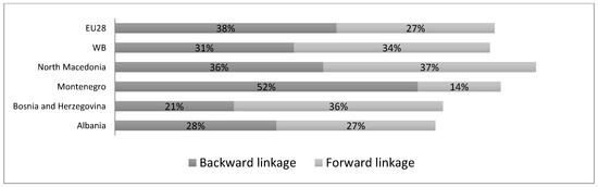 Conversely, the opposite holds for Bosnia and Herzegovina suggesting that the economy operates more at the beginning point of GVC, being more involved in exporting goods of the primary domestic sectors. Finally, North Macedonia and Albania are involved in GVCs 50% upstream and 50% downstream, functioning somewhere in the middle of the chains.