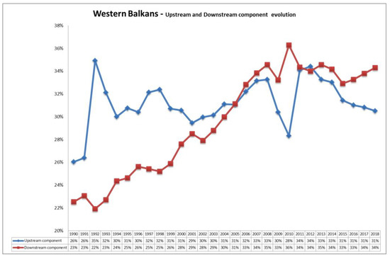 A final piece of evidence on the economic integration into GVCs of the Western Balkans is presented in Figure 3 on plotting the evolution of the upstream and downstream components of the GVC participation rate from 1990 to 2018. There is a clear upward trend in the downstream component moving from slightly above 22% to about 34% which is to be read as a positive sign in terms of VA generated thanks to economic integration. It can be noticed that the downstream component becomes higher than the upstream component in the early 2000s that is, shortly after the beginning of the trade liberalisation process in the region. The upstream component, on the other hand, presents an unsteady evolution. However, while it was above the other component in 1990, at the end of the period of observation it lies three percentage points below it (31% versus 34%) and there seems to be a trend heading towards an increase in that wedge, another good sign in terms of capacity to generate income and VA via trade integration. Finally, the disruptive effects of the recent economic crisis appear to affect the behaviour of both components especially between 2009 and 2011.