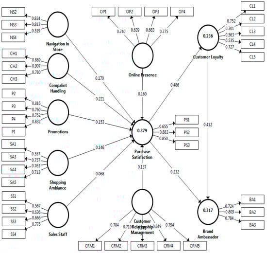 In order to validate the consumer questionnaire, a factor analysis was performed. The validity of the factor structure of analyzed dimensions was verified by factor analysis run in R Studio 1.2.1335 software. Items that represented themselves with a low value (factor loading) in the model were eliminated after performing the factor analysis. Using the parallel analysis, 10 factors were identified that should be considered in the factor analysis. The 10 factors were created with fixed components by principal component analysis method (PCA) and varimax rotation. A value of 0.84 for the Kaiser-Meyer-Olkin (KMO) test confirmed the adequacy of the sample for factor analysis. According to Kaiser (1974), a minimum value of 0.5 is considered, while according to the related literature, a value of KMO > 0.8 is considered very good (Csallner 2015). The result of the Bartlett’s test of sphericity is favorable (χ2 = 8085.23; sig. p < 0.001), which indicates that the correlation matrix in the research is not an identity matrix, therefore the variables are not correlated in the population. The values on the diagonal of the anti-image correlation matrix were all above 0.5 and, therefore each factor is supported to use in the factor analysis. After validation of the factors and factor indicators by factor analysis, also the PLS-SEM analysis was performed.