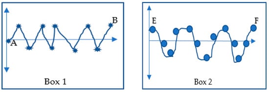 Unfortunately, there have been many economic collapses after the industrial revolution in the mid-18th century. Economists and econometricians are blemished with their predictive foresight’s computational failures, especially forecasting in financial investments. The deep root of the problem is about their fundamental thoughts. Thinking as a traditional econometrician is to model observed information by a random walks model, the easiest way to imitate rational human aspects. Box 1 represented in Figure 2 displays the concept that the random walk model is the logic to reach B from A. This principle’s systematic idea is to sample only a static spot when the arrow is tangible B. However, the critical query is that this fundamental cannot seemingly support the existence of human thinking.