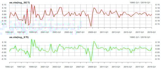 The example of random walk patterns based on Brownian motion. The data visualize two log-return sets of quarterly stock indexes in Thailand (SET) and Singapore (STI) between 1995Q1 and 2019Q1. The fluctuation of index trends is the difference in pitch between positive and negative values, but it inclines stationary (close to 0 and unchangeable) in the long-term consideration.