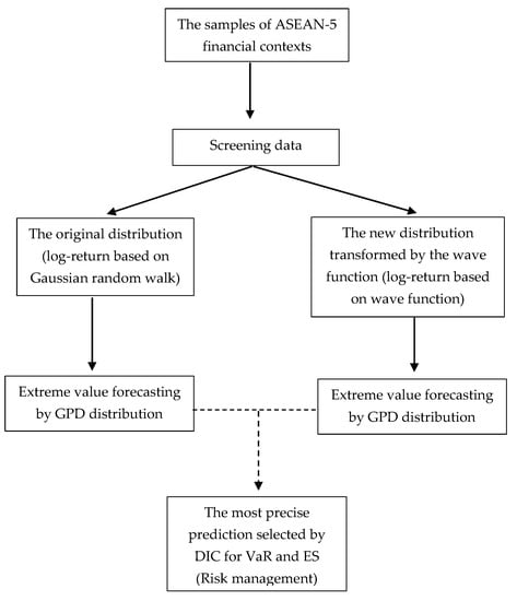 The scope of the research processes is displayed in Figure 5. Expressly, the observations are processed to the section of data visualization (screening data). Descriptive explanation, stationary testing, and normality checking are the main consideration, and then the raw data is modified by two critical concepts—a random walk (Gaussian) distributional set and quantum-wave distribution. The next step is to insert two distinguished data into the function of the Generalized Pareto Distribution (GPD) extreme value analysis. Heavy loss tails are clarified and analyzed by setting the prior density for parameters at the Bayesian estimation threshold. The most precise prediction between two distributions is validated by computing the Deviation Information Criteria (DIC).
