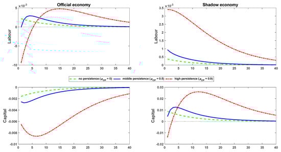 The previous results clearly reveal that in all cases, the growth of corruption results in an increase in activity in the shadow economy sector, while the impact is greater the higher the persistence is (i.e., the expected persistence of the impulse in the perception of corruption). In simple terms, it is possible to confirm the intuitive opinion, which is also backed by theoretical studies and the empirical experience, that an increase in perceived corruption supports the shadow economy’s growth. However, an important finding emerging from the simulations is the fact that corruption and its perception have a significantly different effect on the two key production factors.
