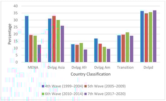 One possible reason for this decline is the Arab Spring, including the circumstances that led up to it (occurring during wave 5), its beginnings (during wave 6) and its lasting ramifications, from which several MENA economies are still suffering. The Arab Spring was exemplified by violence and upheaval in several countries as well as political and social fragmentation, even within individual families. Given the Arab regional identity, this implies that increased group tension during the uprising could harm interpersonal trust across the region (Spierings 2019). Furthermore, in several countries the actions of those who came into political power after the uprising may have changed people’s general views on trustworthiness, particularly in those countries whose new leaders were untrustworthy and corrupt. Even before the Arab Spring, the economic, political, and social circumstances that led to its occurrence might have manifested themselves in the massive drop in the trust values described above. It is still an interesting observation and perhaps requires more in-depth research, that during the worst years of disruptions—that of the Arab Spring itself (wave 6), trust did not drop as much as it did before the onset of the Arab Spring (from wave 4 to wave 5) and after it (moving from wave 6 to wave 7).