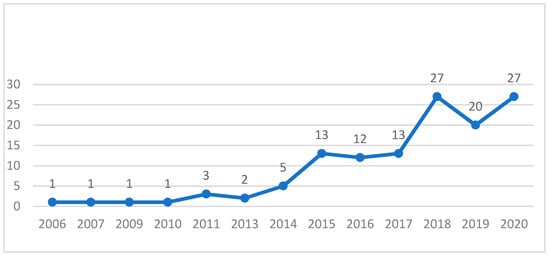 Concerning the temporal evolution of the articles published on the subject under study, Figure 1 shows researchers’ growing interest. Thus, there has been a substantial growth from 2015 onwards, with the most productive year for the publication of research articles on social accounting and its dissemination being the year 2018, with 27 publications, and it is now the year 2020, with 27 publications. This means that the subject continues to arouse growing interest in the scientific community.