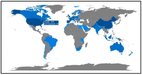 Figure 2 shows the scientific production of the United States of America with 43 publications, Italy (40), China (31), Spain (8), and the United Kingdom (4). In China’s case, the interest comes from the importance that the extractive industry has assumed in the economic activity of this country. Here, the negative impacts (e.g., a significant number of accidents in recent years) have triggered the academic world’s interest in studying social accounting and its dissemination in this country.