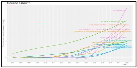 The following graph (Figure 3) shows each journal’s growth over the years, with Sustainability, Journal of Business Ethics, and Accounting, Auditing and Accountability Journal, especially from 2014 onwards.